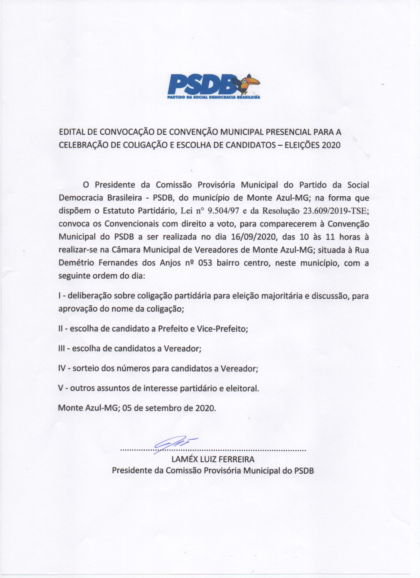 O Presidente da Comissão Provisória Municipal do PSDB - Partido da Social Democracia Brasileira, do município de Monte Azul - Minas Gerais; o senhor Laméx Luiz Ferreira, na forma que dispõem o Estatuto Partidário, Lei 9.504 de 1997 e da Resolução do TSE 23.609 de 2019; convoca os Convencionais com direito a voto, para comparecerem à Convenção Municipal do PSDB a ser realizada no dia 16 de Setembro de 2020, das 10 às 11 horas à realizar-se na Câmara Municipal de Vereadores de Monte Azul - Minas Gerais; situada à Rua Demétrio Fernandes dos Anjos, Número 85 - Bairro Centro, neste município, com a seguinte ordem do dia: